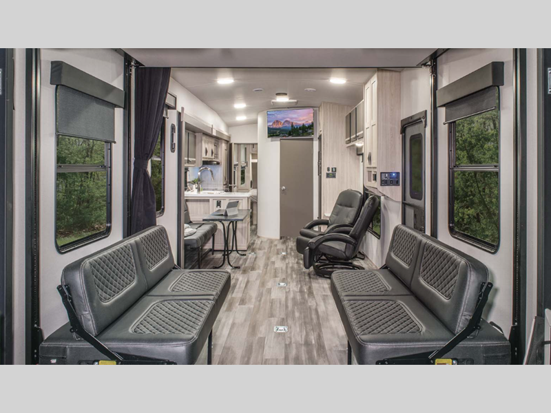 Sleeps 7 Slides 2 Length 37 ft 11 in Ext Width 8 ft 6 in Ext Height 12 ft 10 in Hitch Weight 1322 lbs GVWR 12800 lbs Dry Weight 9812 lbs Cargo Capacity 2940 lbs Fresh Water Capacity 98 gals Grey Water Capacity 60 gals Black Water Capacity 60 gals Tire Size 16" Furnace BTU 35000 btu Fuel Capacity 30 gals Number Of Bunks 1 Available Beds King Refrigerator Type 12V Refrigerator Size 10.7 cu ft Cooktop Burners 3 Number of Awnings 1 Axle Weight 6000 lbs Garage Size 13 ft 6 in LP Tank Capacity 30 lbs Water Heater Capacity 10 gal Water Heater Type LP/110/DSI AC BTU 15000 btu TV Info Ext. TV Awning Info 19' Power with LED Lights Axle Count 2 Number of LP Tanks 2 Shower Type Standard Electrical Service 30 amp Similar Floorplans