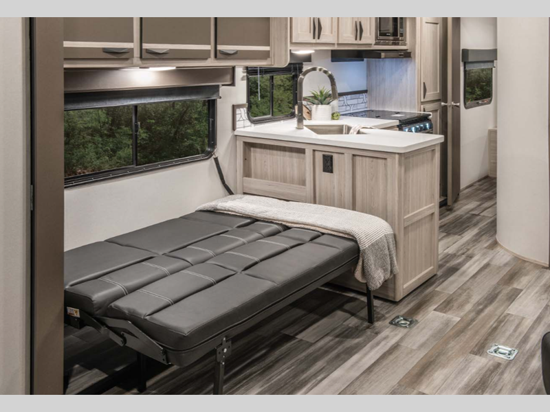Sleeps 6 Slides 1 Length 35 ft 11 in Ext Width 8 ft 6 in Ext Height 12 ft 10 in Fresh Water Capacity 98 gals Grey Water Capacity 57 gals Black Water Capacity 57 gals Tire Size 16" Furnace BTU 35000 btu Fuel Capacity 30 gals Number Of Bunks 1 Available Beds King Refrigerator Type 12V Refrigerator Size 10.7 cu ft Cooktop Burners 3 Number of Awnings 1 Axle Weight 6000 lbs Garage Size 18 ft LP Tank Capacity 30 lbs Water Heater Capacity 10 gal Water Heater Type LP/110/DSI AC BTU 15000 btu Awning Info 20' Power with LED Lights Axle Count 2 Number of LP Tanks 2 Shower Type Radius Electrical Service 30 amp Similar Floorplans