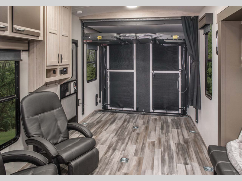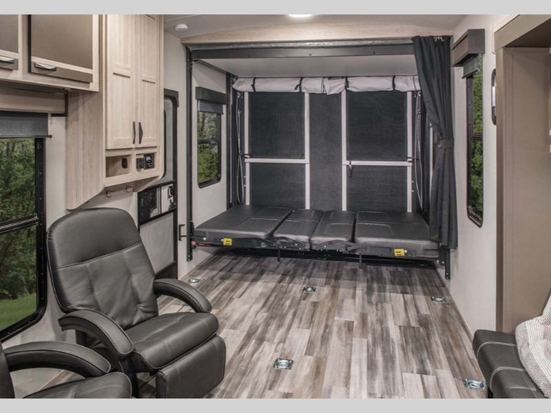 - Dual power Happi-Jac opposing sofa beds in garages w/ queen bed above