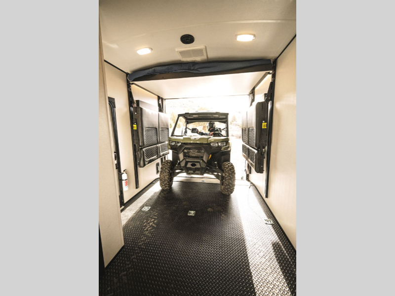 Answer the call of adventure in a Stryker toy hauler travel trailer by Cruiser! The outdoor enthusiast will be happy to find an easy load 8' ramp door, enhanced cargo space with 5,000 lb. tie-down rings, and an upgraded suspension to maneuver tougher terrain.