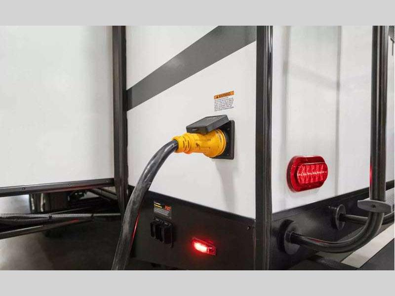 You can make yourself at home with solid pressed membrane countertops, interior LED lights, and black roller shades for added privacy. The outside shower with hot and cold water will let you easily wash off camp gear, and the marine grade exterior speakers will allow you to be the life of the campground. You will also appreciate the universal docking station for easy access to your hookups, plus a high-output on-demand tankless water heater for hot water when you need it.