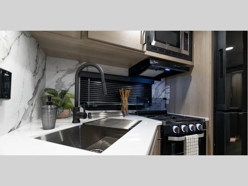 Each is built with 6-sided aluminum cage construction, a fully laminated walkable roof, and aluminum truss roof bracing for added support. You will love the standard features such as, a 200W solar panel, a Key-Alike lock system, and a Winegard Air 360+ prepped for Wi-Fi. The Coast to Coast Package includes amenities that will make you feel right at home including, solid surface kitchen countertops, roller shades, and soft close roller bearing drawers.