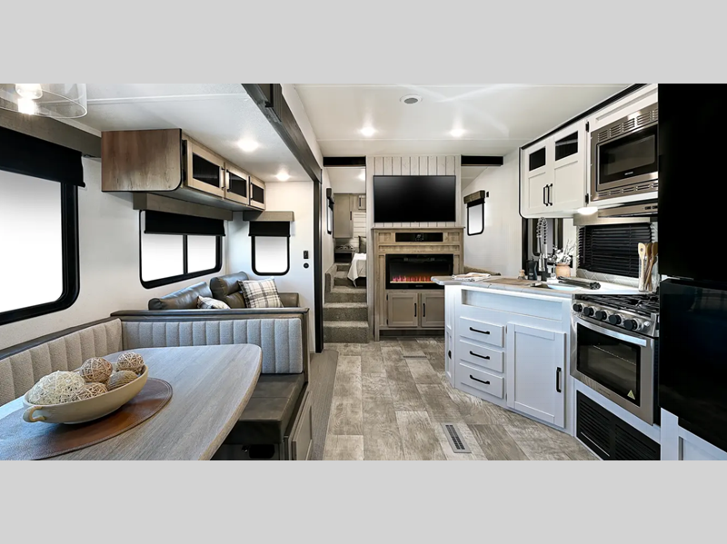 Sleeps 8 Slides 2 Length 34 ft 4 in Ext Width 8 ft Ext Height 12 ft 4 in Interior Color Cognac, Stone Hitch Weight 1358 lbs GVWR 10750 lbs Dry Weight 8732 lbs Cargo Capacity 2018 lbs Fresh Water Capacity 43 gals Grey Water Capacity 35 gals Black Water Capacity 30 gals Furnace BTU 5100 btu Number Of Bunks 2 Available Beds Queen Refrigerator Type 12V Black Glass Refrigerator Size 11 cu ft Shower Size 32" x 40" Number of Awnings 1 Water Heater Capacity 6 gal Water Heater Type Gas/Electric Awning Info 18' Electric with LED Lights Axle Count 2 Shower Type Shower w/Seat Electrical Service 50 amp Similar Floorplans